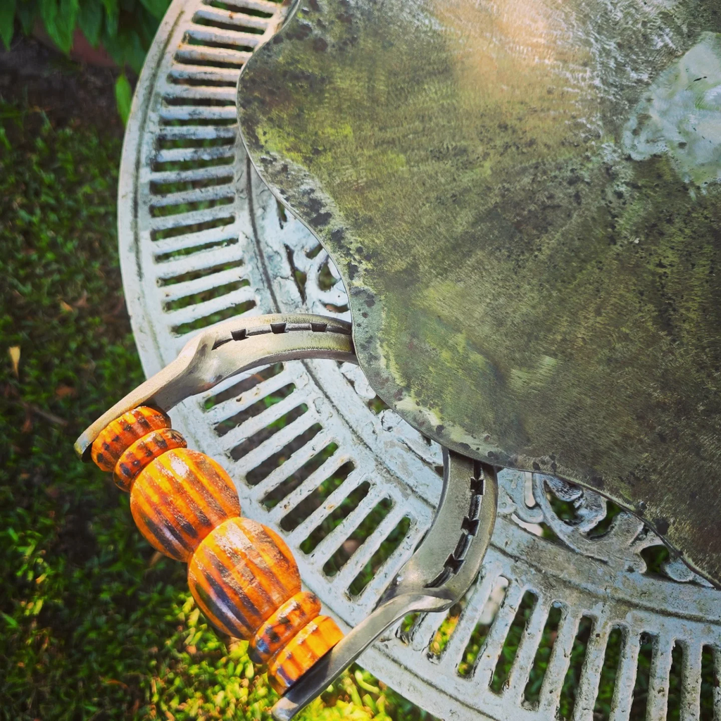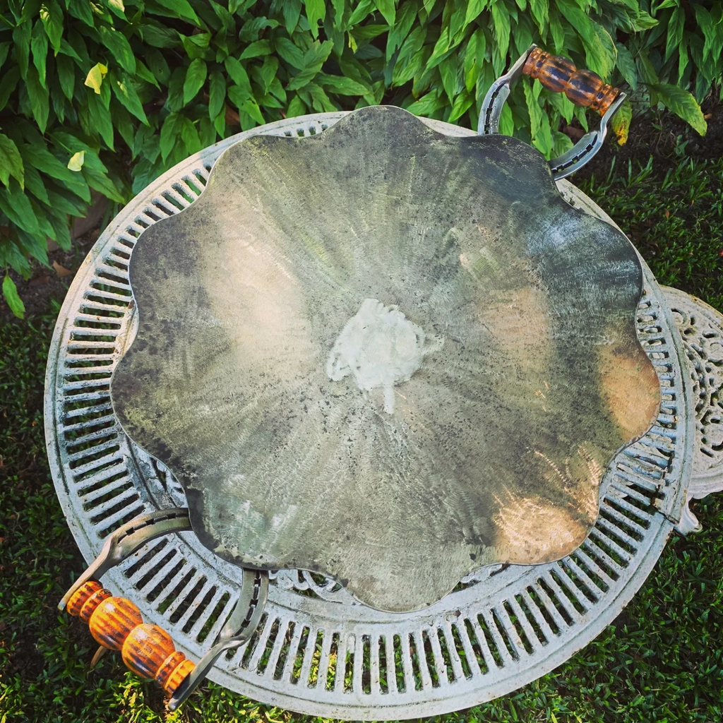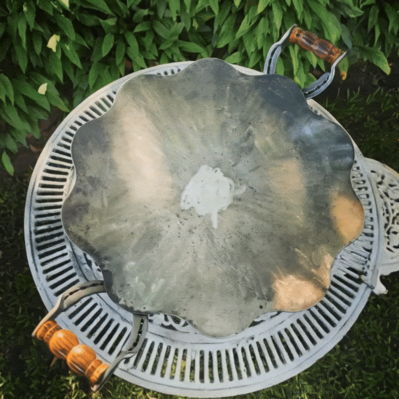 Esse disco de arado traz o visual único da borda ondulada — um acabamento que remete às pétalas de uma flor flamejante — aliado à resistência bruta da chapa de trator. O grande destaque fica por conta dos cabos torneados em madeira com acabamento flamejado, que além de firmes, são um espetáculo à parte.