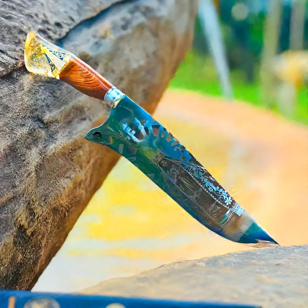 Uma peça que carrega fé, força e tradição. A Faca Santa Maria é forjada à mão com aço de alta qualidade e acabamento rústico. No cabo, a imagem de Santa Maria banhada em resina traz proteção e simbolismo para o dia a dia na cozinha, no campo ou no churrasco.